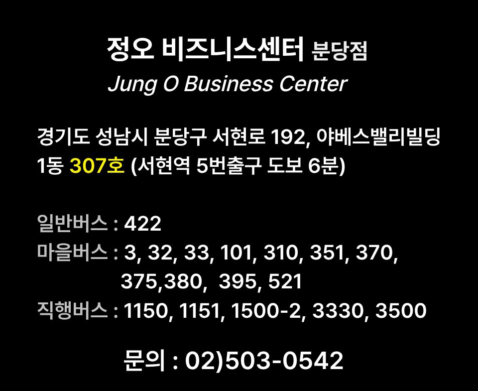 | 주 소 | 경기도 성남시 분당구 서현로 192, 야베스밸리빌딩 3층 307호 |